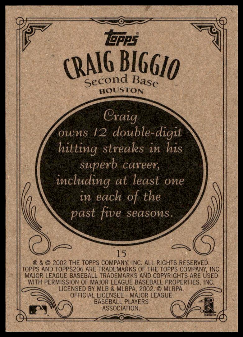 This Baseball card, from 2002 is part of the Topps 206 card set. Craig Biggio is featured and has a card number of 15.
