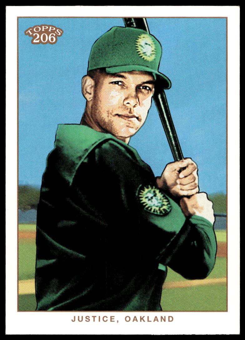 This Baseball card, from 2002 is part of the Topps 206 card set. David Justice is featured and has a card number of 52.