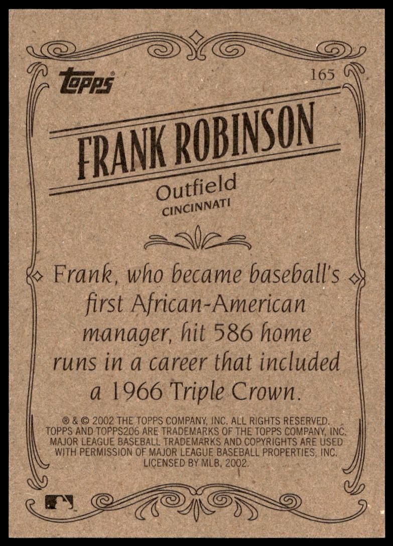 This BaseballΒ card, from 2002 is part of the Topps 206Β card set. Frank Robinson is featured and has a card number of 165.