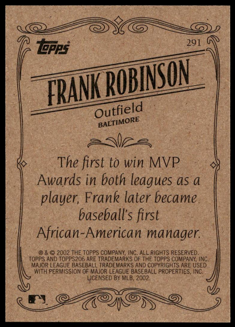 This BaseballΒ card, from 2002 is part of the Topps 206Β card set. Frank Robinson is featured and has a card number of 291.