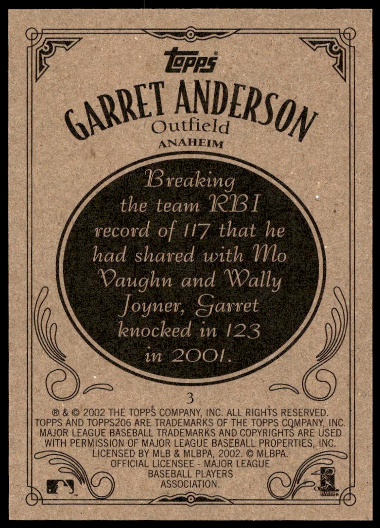 This Baseball card, from 2002 is part of the Topps 206 card set. Garret Anderson is featured and has a card number of 3.