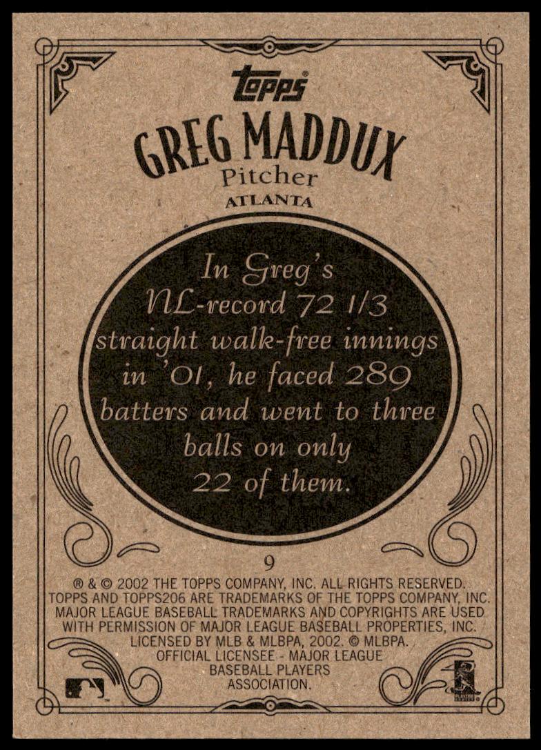 This Baseball card, from 2002 is part of the Topps 206 card set. Greg Maddux is featured and has a card number of 9.