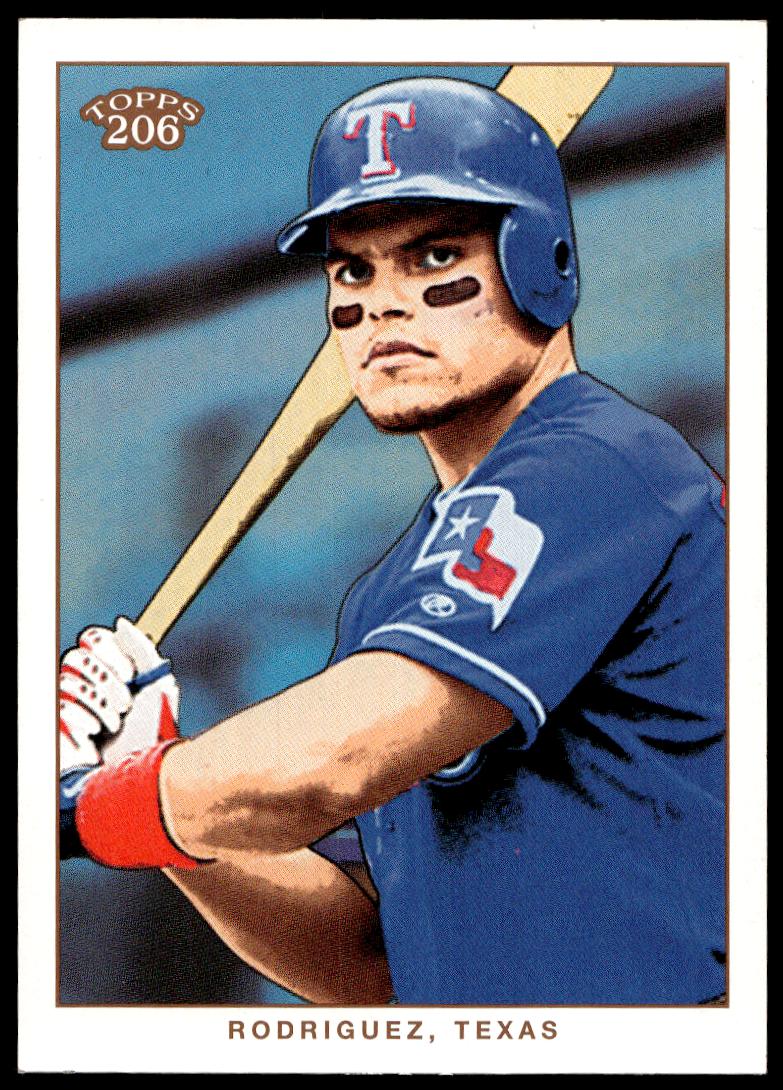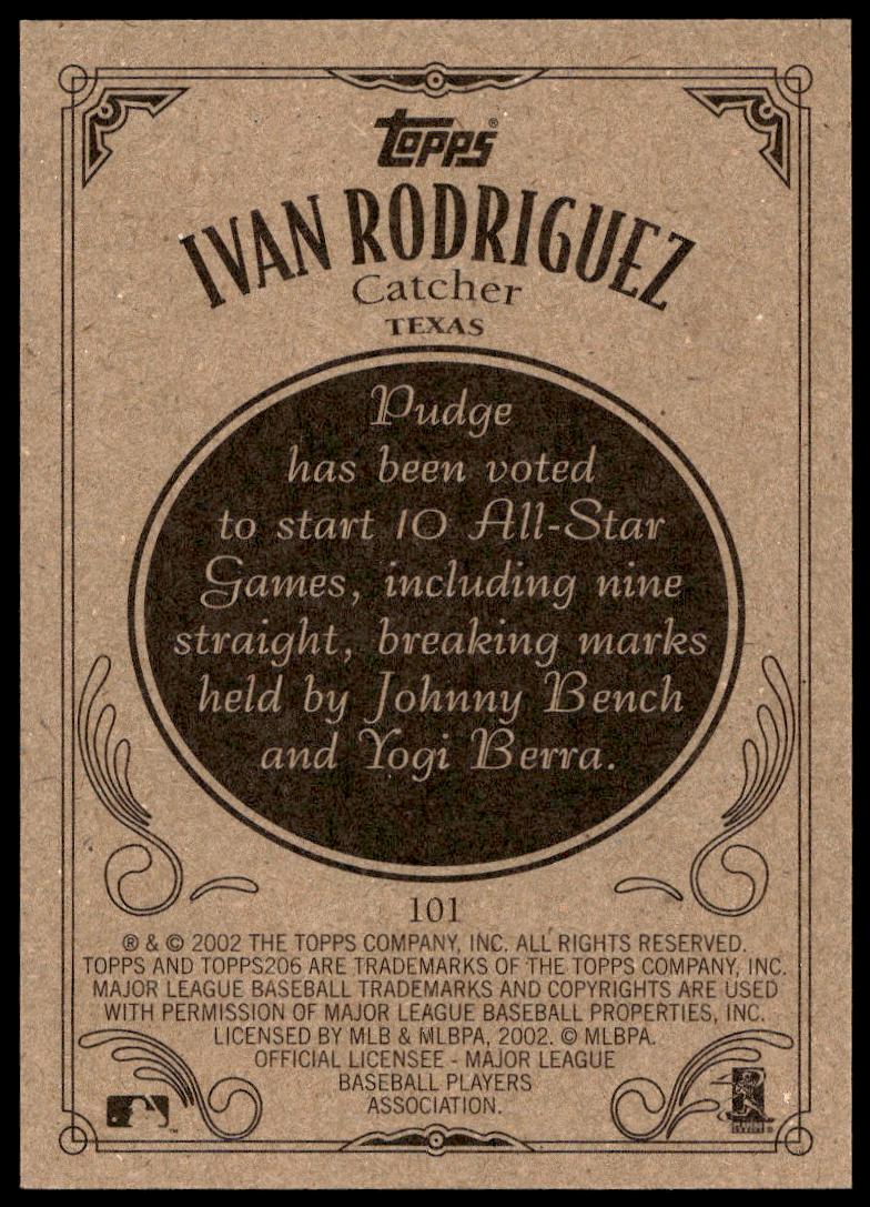 This Baseball card, from 2002 is part of the Topps 206 card set. Ivan Rodriguez is featured and has a card number of 101.