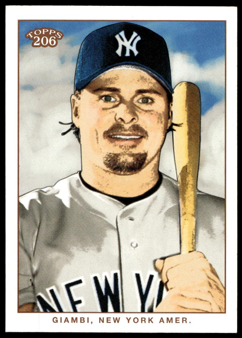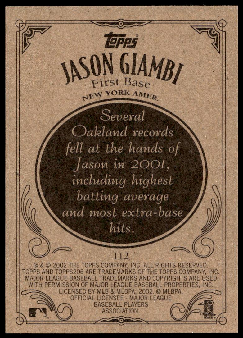 This Baseball card, from 2002 is part of the Topps 206 card set. Jason Giambi is featured and has a card number of 112.