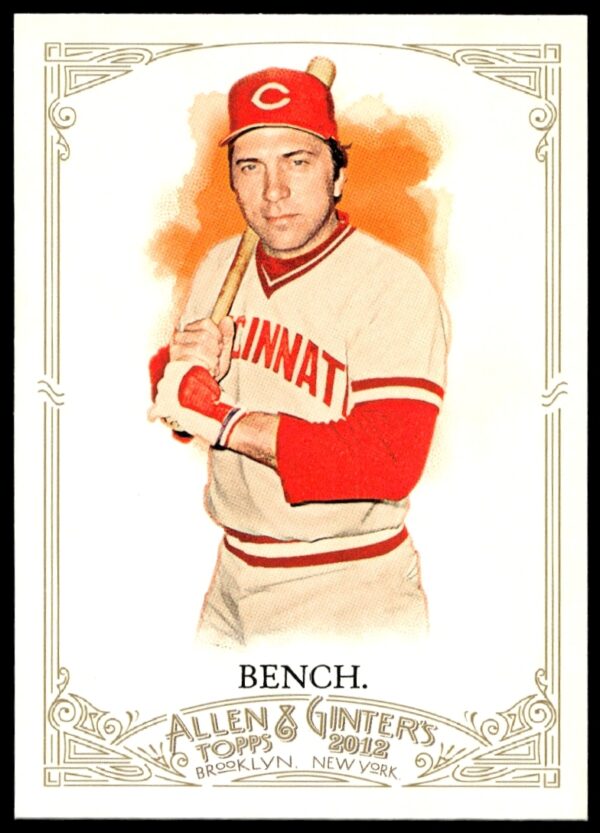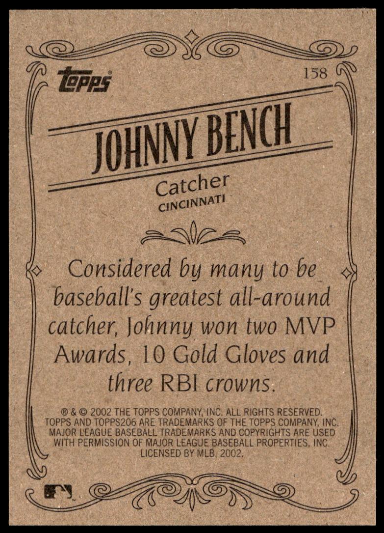 This Baseball card, from 2002 is part of the Topps 206 card set. Johnny Bench is featured and has a card number of 158.