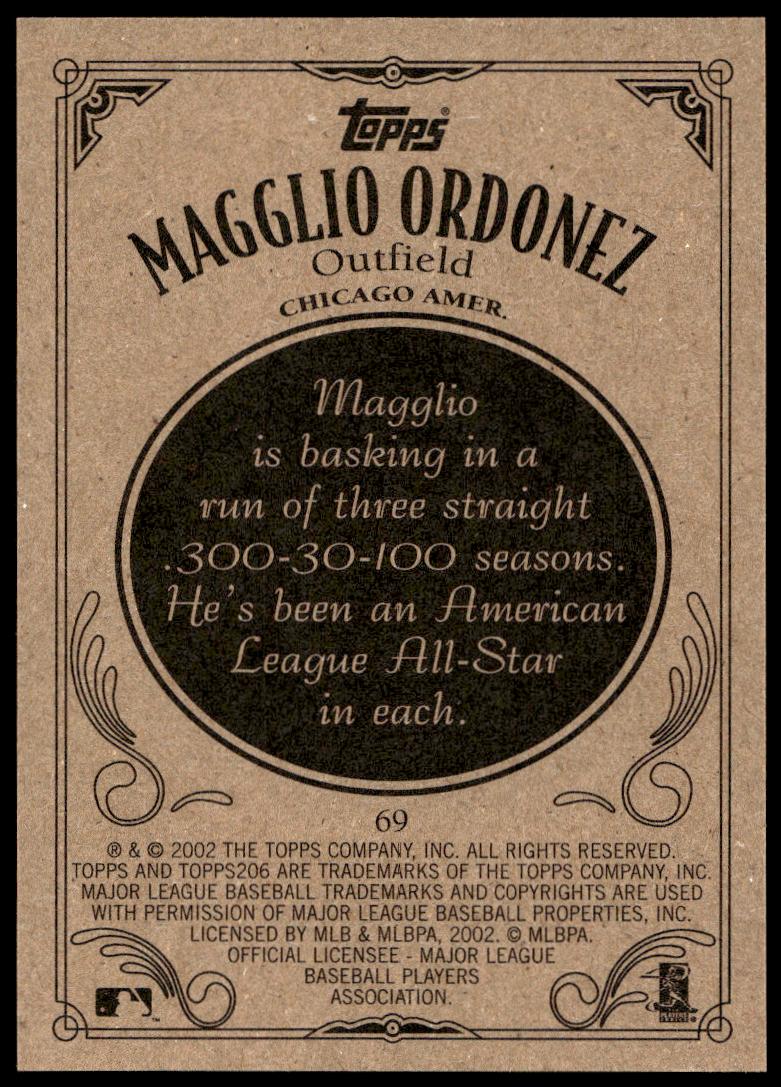 This BaseballΒ card, from 2002 is part of the Topps 206Β card set. Magglio Ordonez is featured and has a card number of 69.