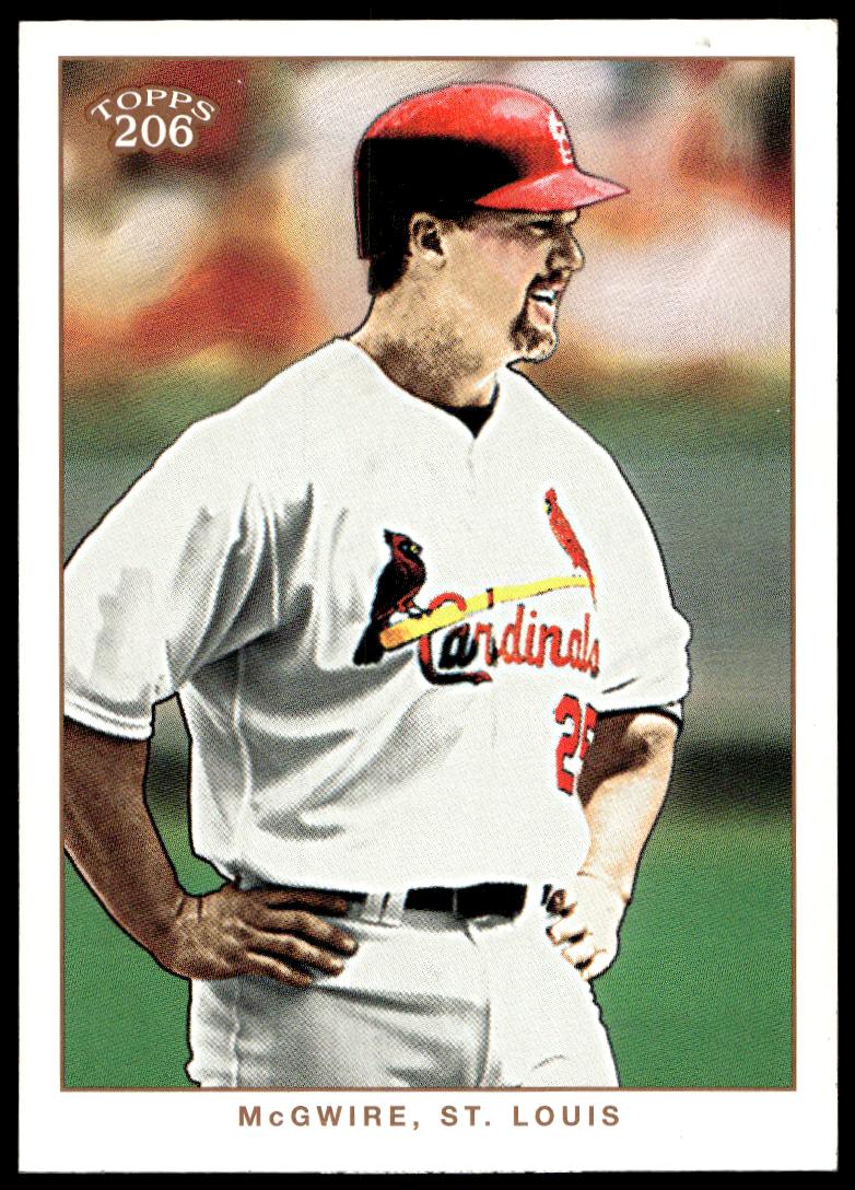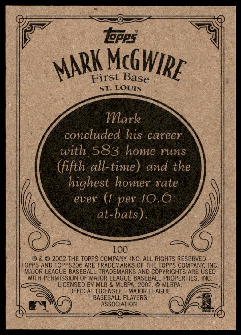 This Baseball card, from 2002 is part of the Topps 206 card set. Mark McGwire is featured and has a card number of 100.