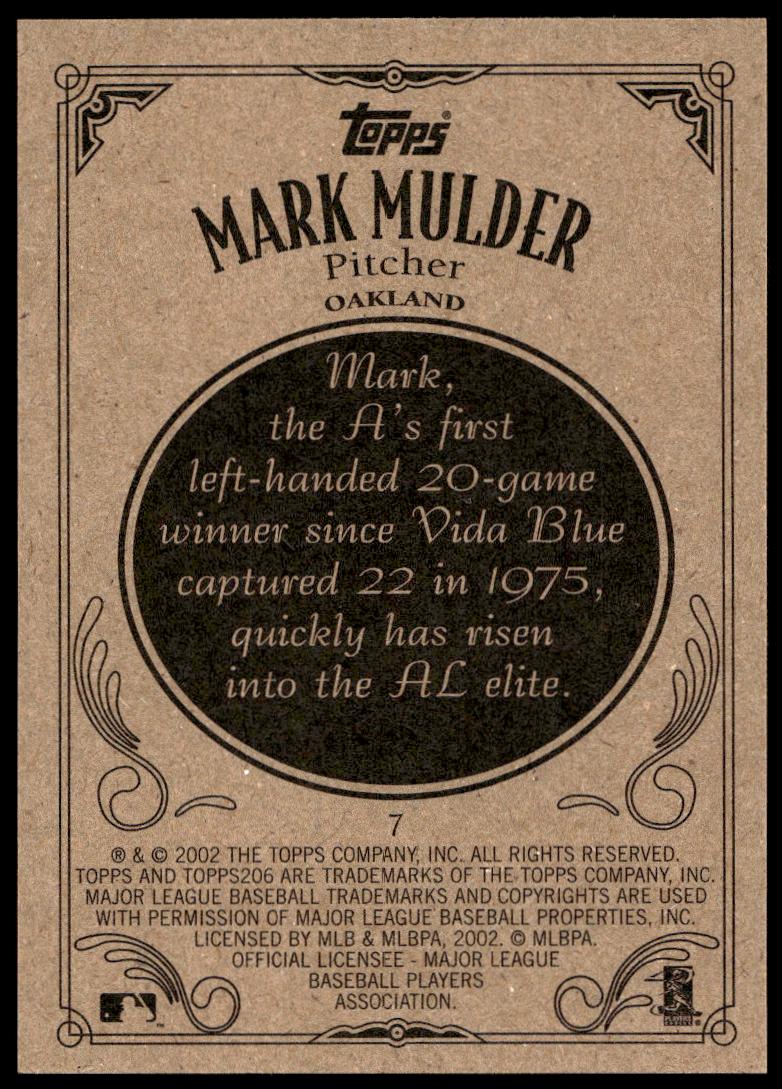 This Baseball card, from 2002 is part of the Topps 206 card set. Mark Mulder is featured and has a card number of 7.