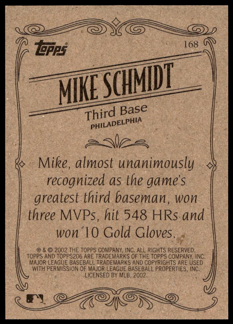This Baseball card, from 2002 is part of the Topps 206 card set. Mike Schmidt is featured and has a card number of 168.