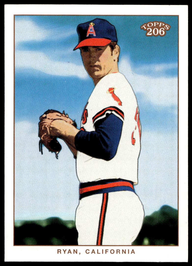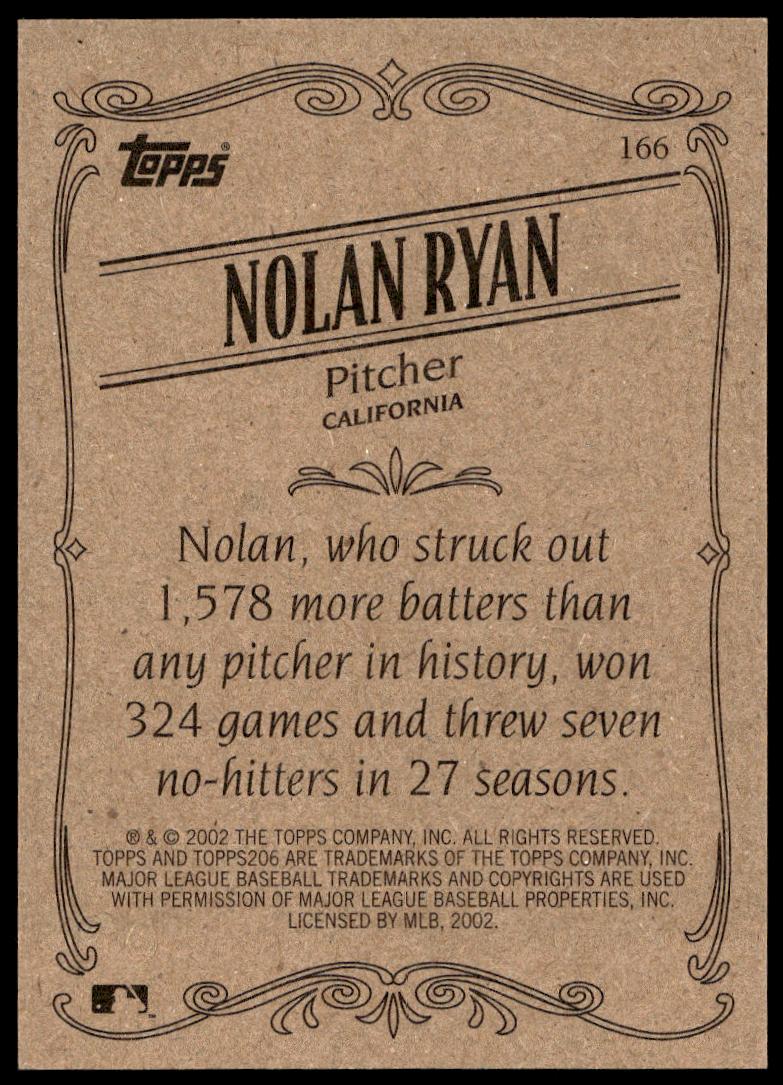 This Baseball card, from 2002 is part of the Topps 206 card set. Nolan Ryan is featured and has a card number of 166.