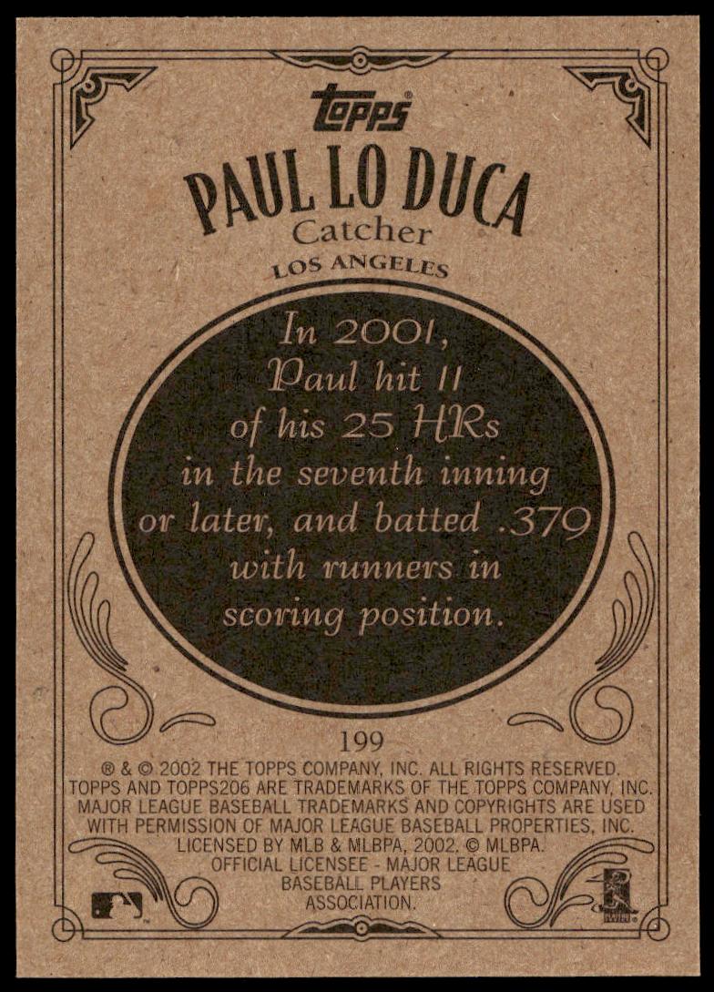 This Baseball card, from 2002 is part of the Topps 206 card set. Paul Lo Duca is featured and has a card number of 199.