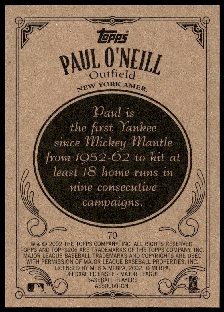 This Baseball card, from 2002 is part of the Topps 206 card set. Paul O’Neill is featured and has a card number of 70.
