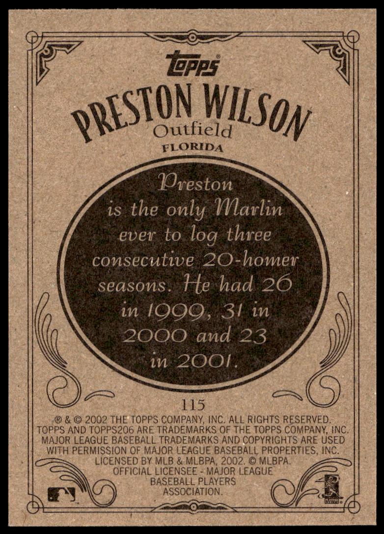 This BaseballΒ card, from 2002 is part of the Topps 206Β card set. Preston Wilson is featured and has a card number of 115.