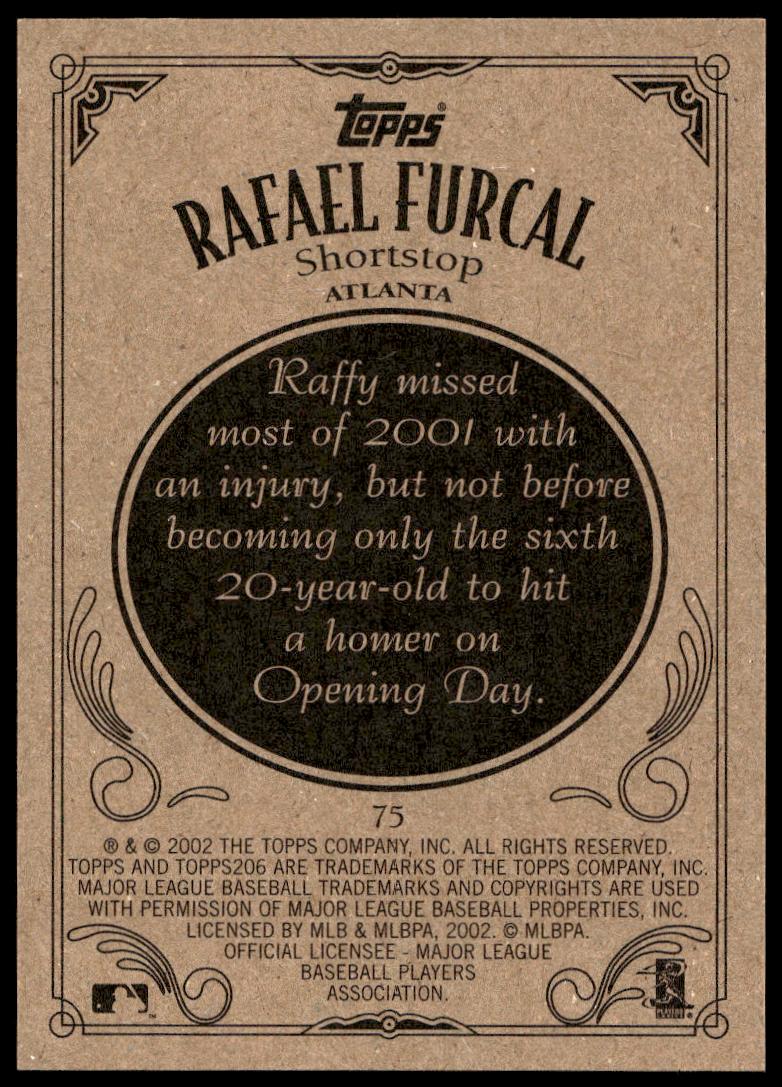 This Baseball card, from 2002 is part of the Topps 206 card set. Rafael Furcal is featured and has a card number of 75.