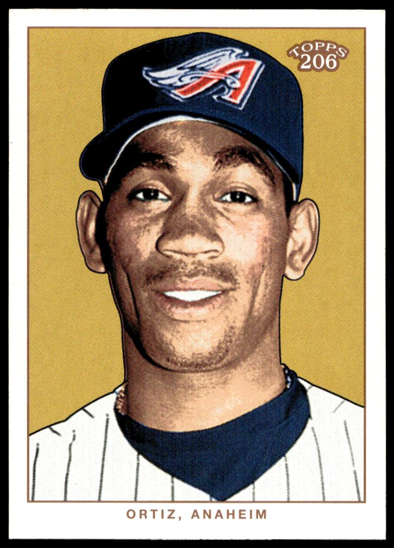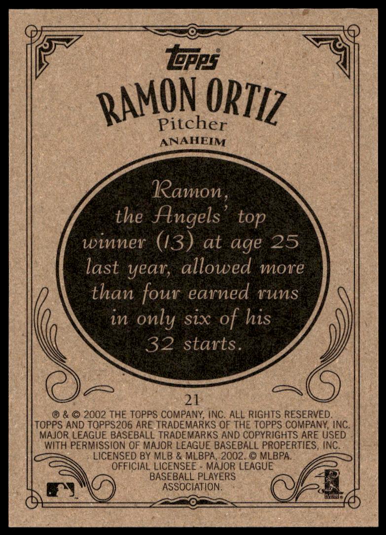 This Baseball card, from 2002 is part of the Topps 206 card set. Ramon Ortiz is featured and has a card number of 21.