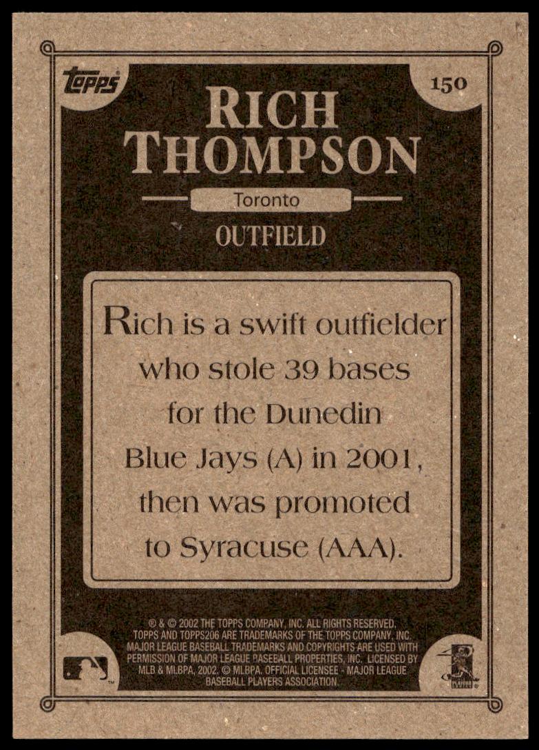 This Baseball card, from 2002 is part of the Topps 206 card set. Rich Thompson is featured and has a card number of 150.