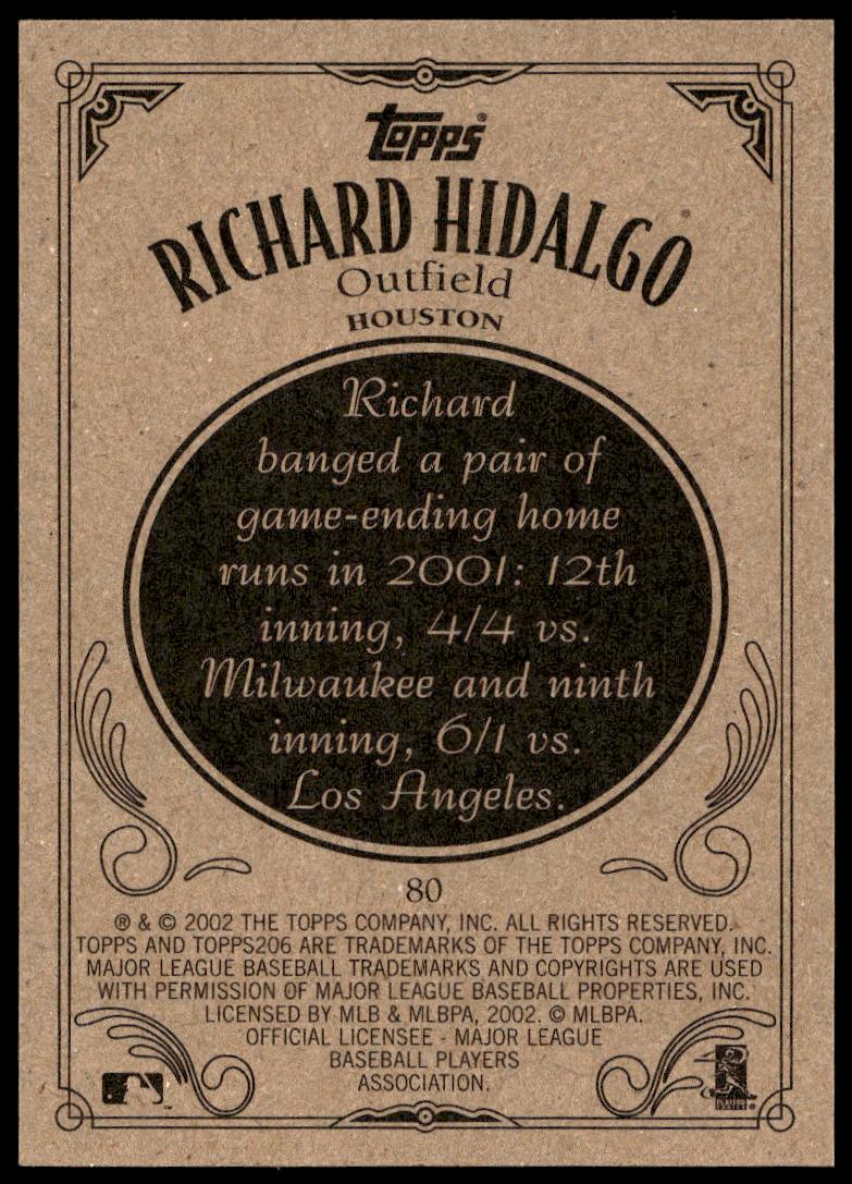 This BaseballΒ card, from 2002 is part of the Topps 206Β card set. Richard Hidalgo is featured and has a card number of 80.
