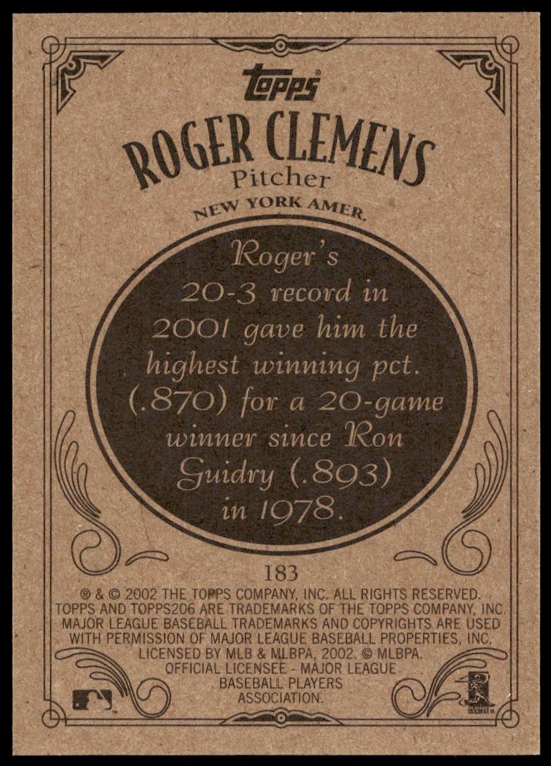 This Baseball card, from 2002 is part of the Topps 206 card set. Roger Clemens is featured and has a card number of 183.