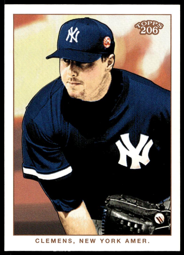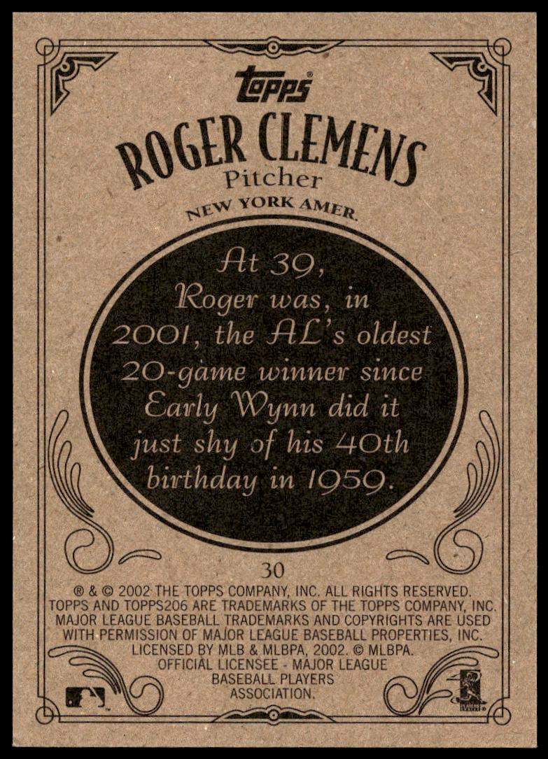 This Baseball card, from 2002 is part of the Topps 206 card set. Roger Clemens is featured and has a card number of 30.