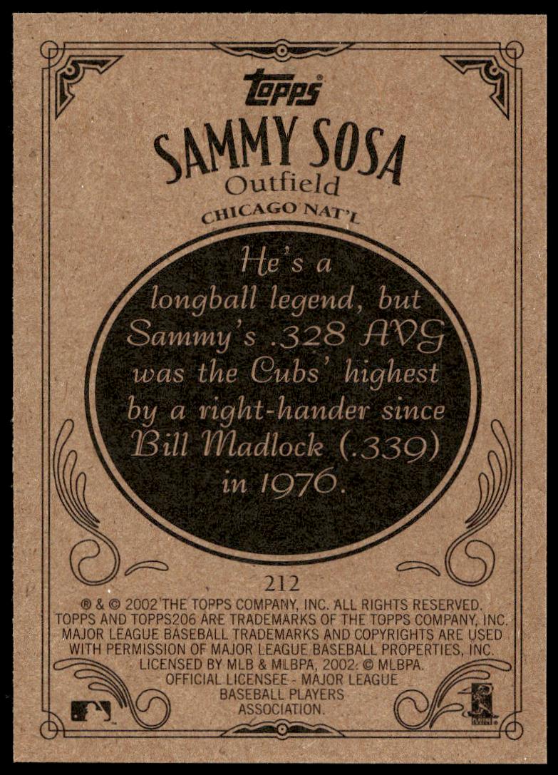 This Baseball card, from 2002 is part of the Topps 206 card set. Sammy Sosa is featured and has a card number of 212.
