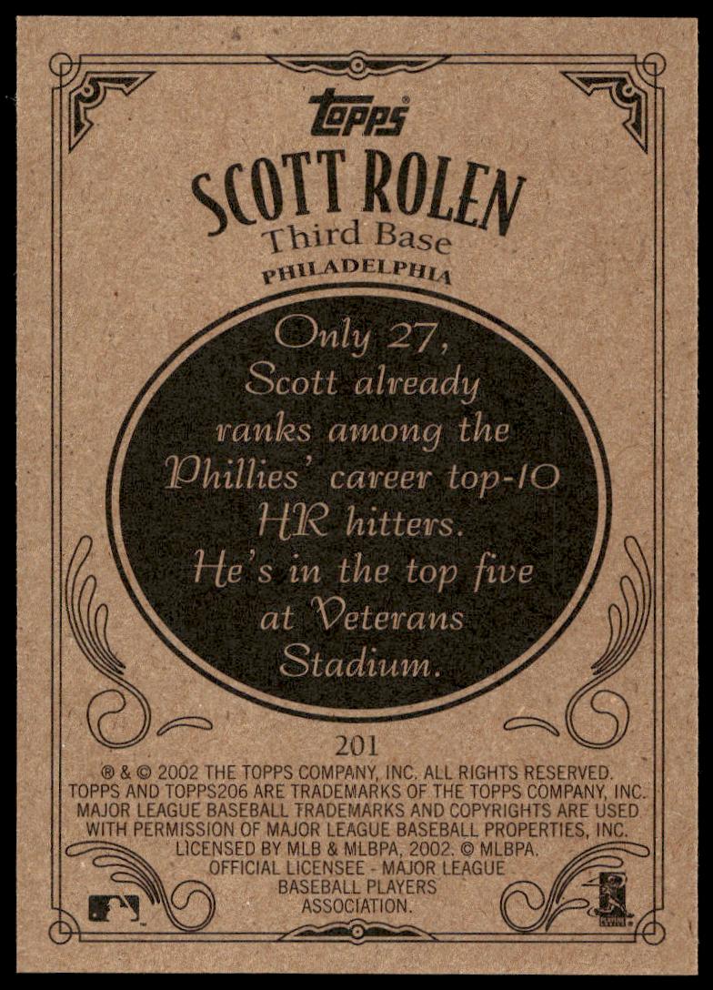 This Baseball card, from 2002 is part of the Topps 206 card set. Scott Rolen is featured and has a card number of 201.
