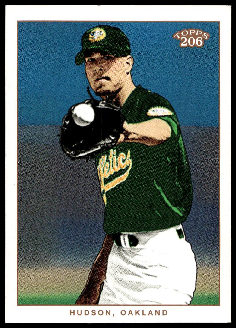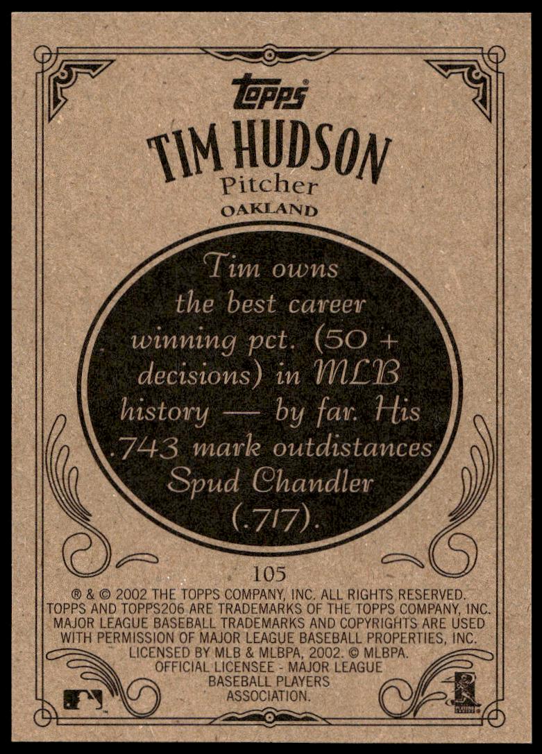 This Baseball card, from 2002 is part of the Topps 206 card set. Tim Hudson is featured and has a card number of 105.