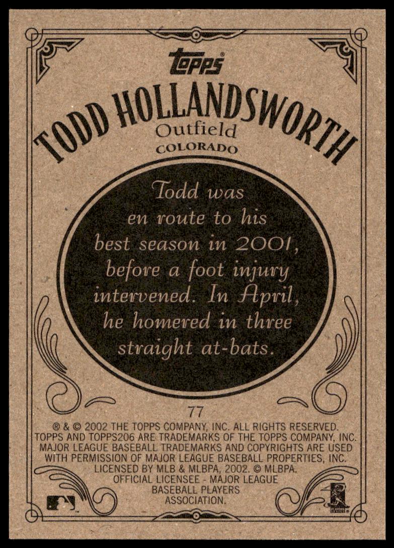 This Baseball card, from 2002 is part of the Topps 206 card set. Todd Hollandsworth is featured and has a card number of 77.