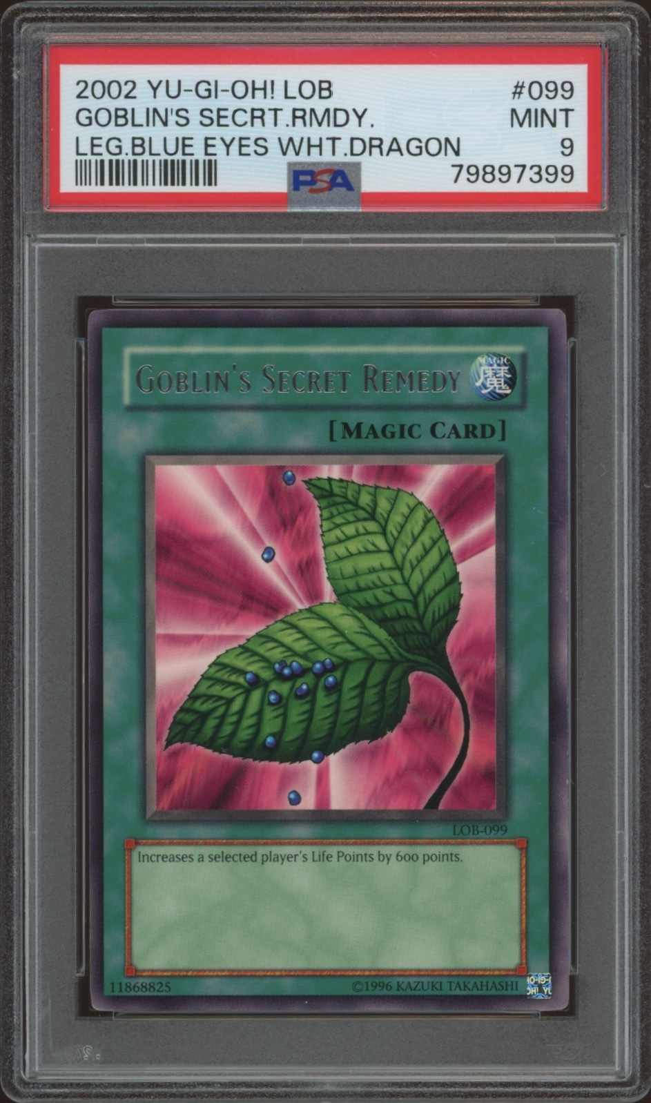 This card, from 2002 is part of the Yu-Gi-Oh! Legend of Blue Eyes White Dragon card set. Goblin’s Secret Remedy is featured and has a card number of LOB-099. It is graded by PSA and has a numeric grade of 9.