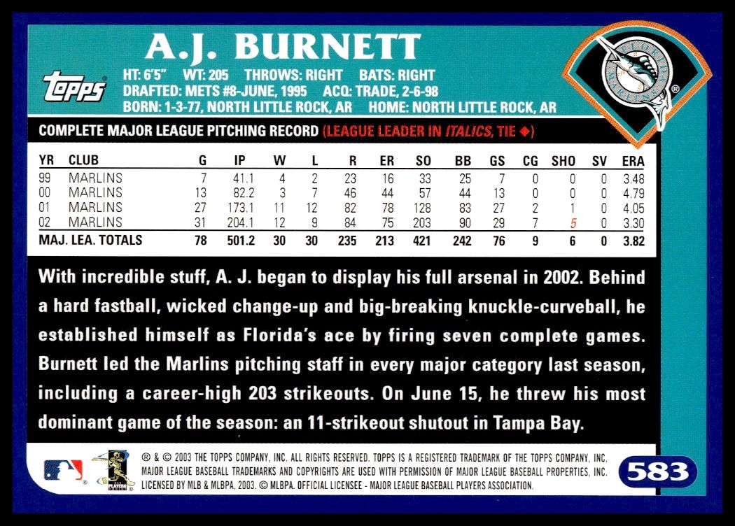 This Baseball card, from 2003 is part of the Topps  card set. A.J. Burnett is featured and has a card number of 583.