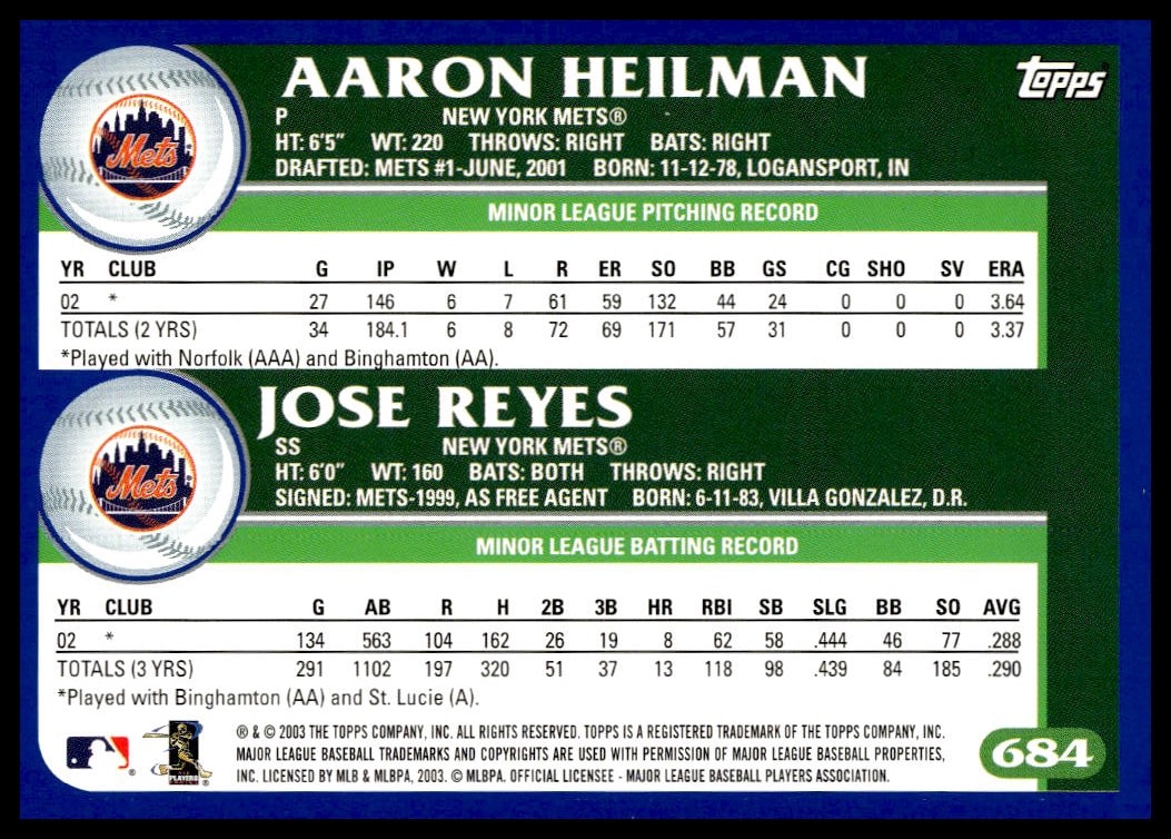 This Baseball card, from 2003 is part of the Topps  card set. Aaron Heilman / Jose Reyes is featured and has a card number of 684.