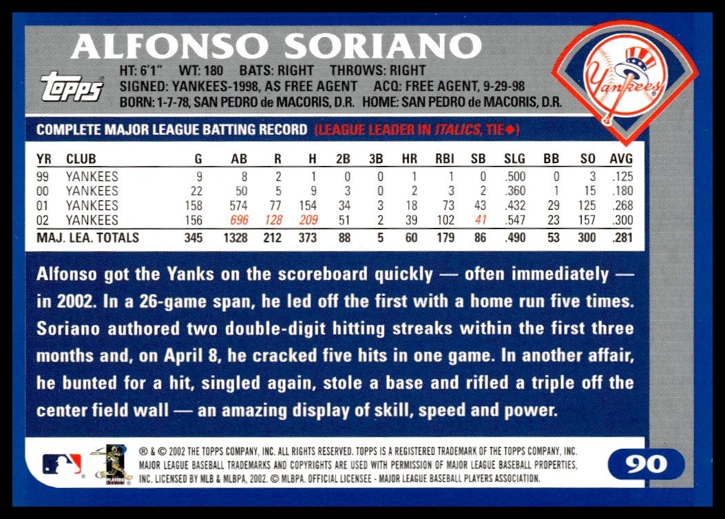 This Baseball card, from 2003 is part of the Topps  card set. Alfonso Soriano is featured and has a card number of 90.