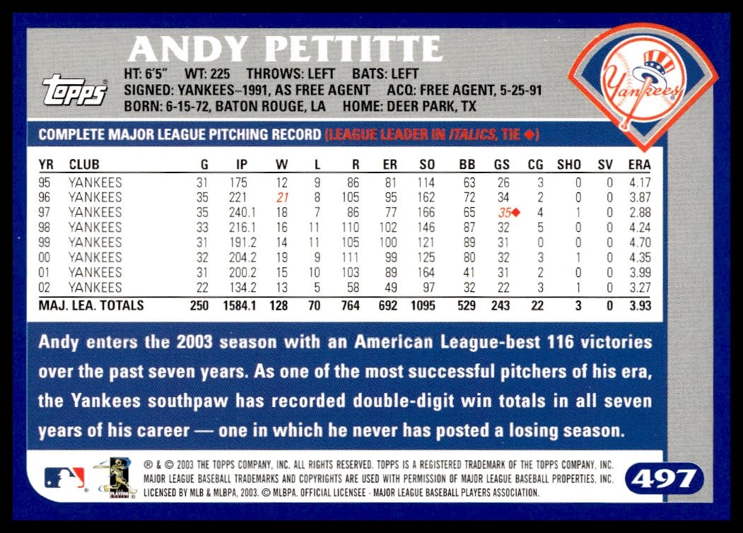 This Baseball card, from 2003 is part of the Topps  card set. Andy Pettitte is featured and has a card number of 497.