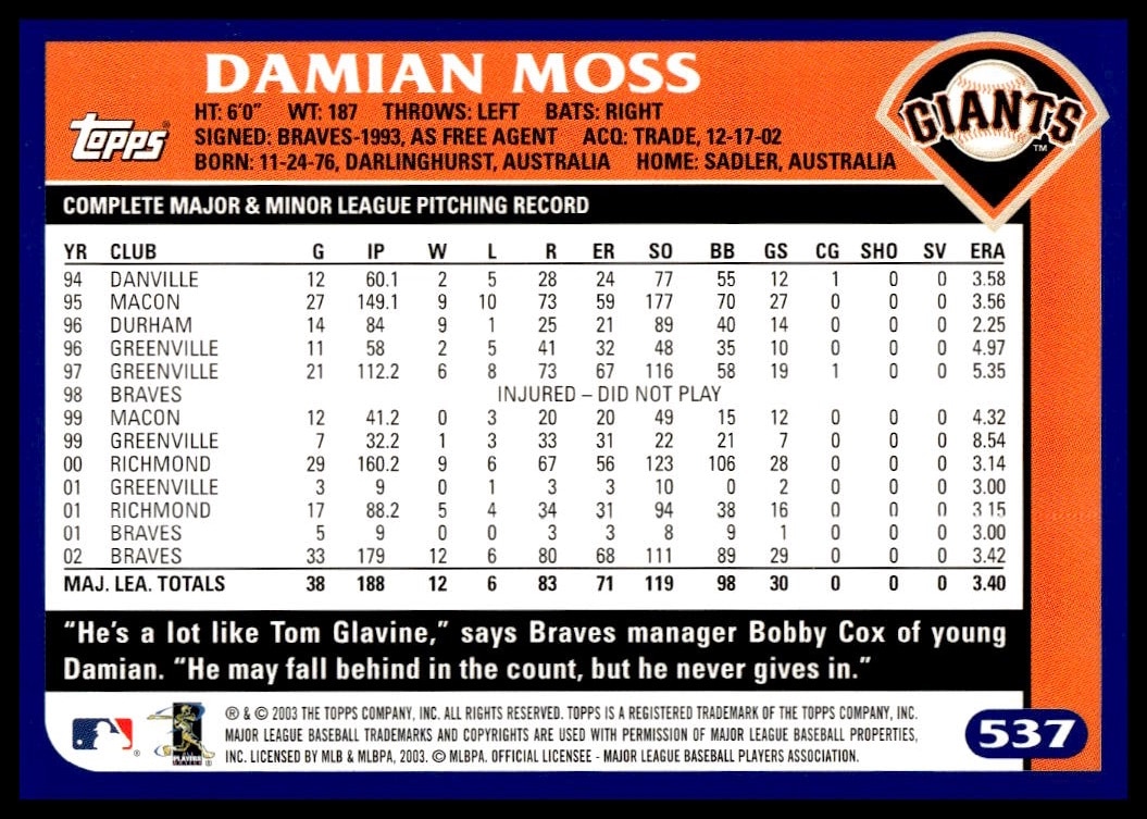 This Baseball card, from 2003 is part of the Topps  card set. Damian Moss is featured and has a card number of 537.