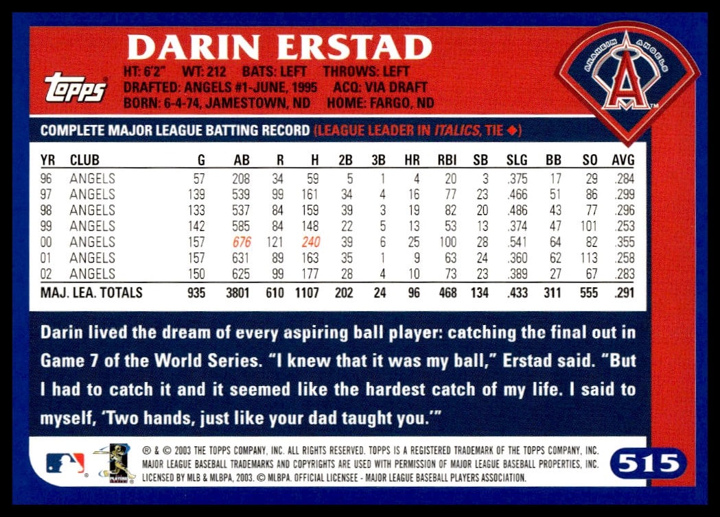 This Baseball card, from 2003 is part of the Topps  card set. Darin Erstad is featured and has a card number of 515.