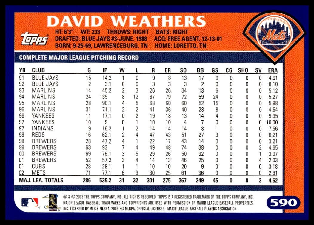 This Baseball card, from 2003 is part of the Topps  card set. David Weathers is featured and has a card number of 590.