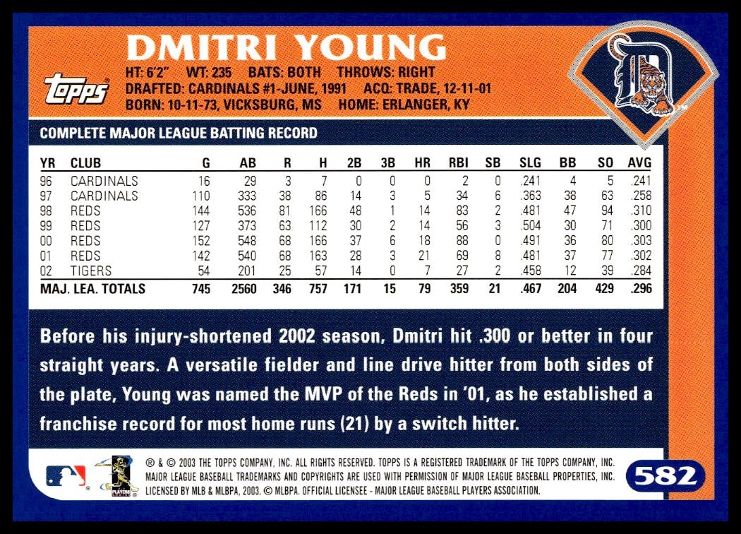 This Baseball card, from 2003 is part of the Topps  card set. Dmitri Young is featured and has a card number of 582.