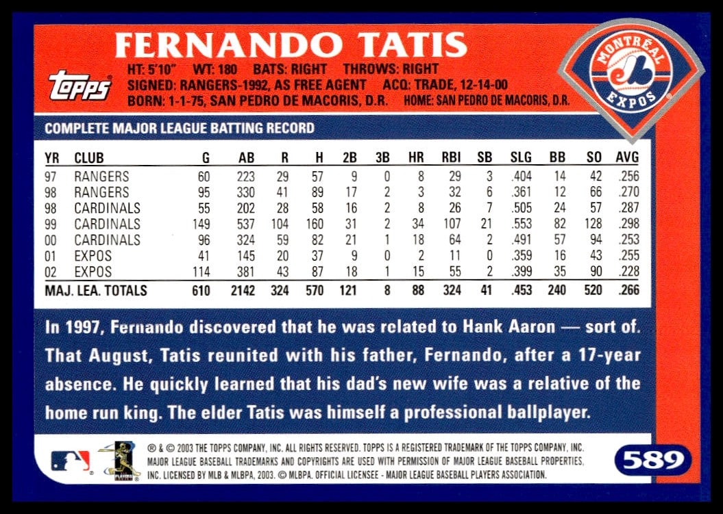 This Baseball card, from 2003 is part of the Topps  card set. Fernando Tatis is featured and has a card number of 589.