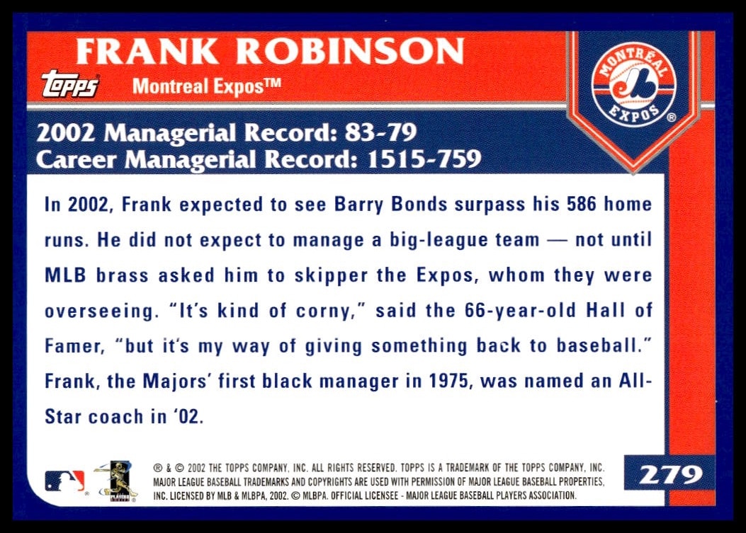 This Baseball card, from 2003 is part of the Topps  card set. Frank Robinson is featured and has a card number of 279.