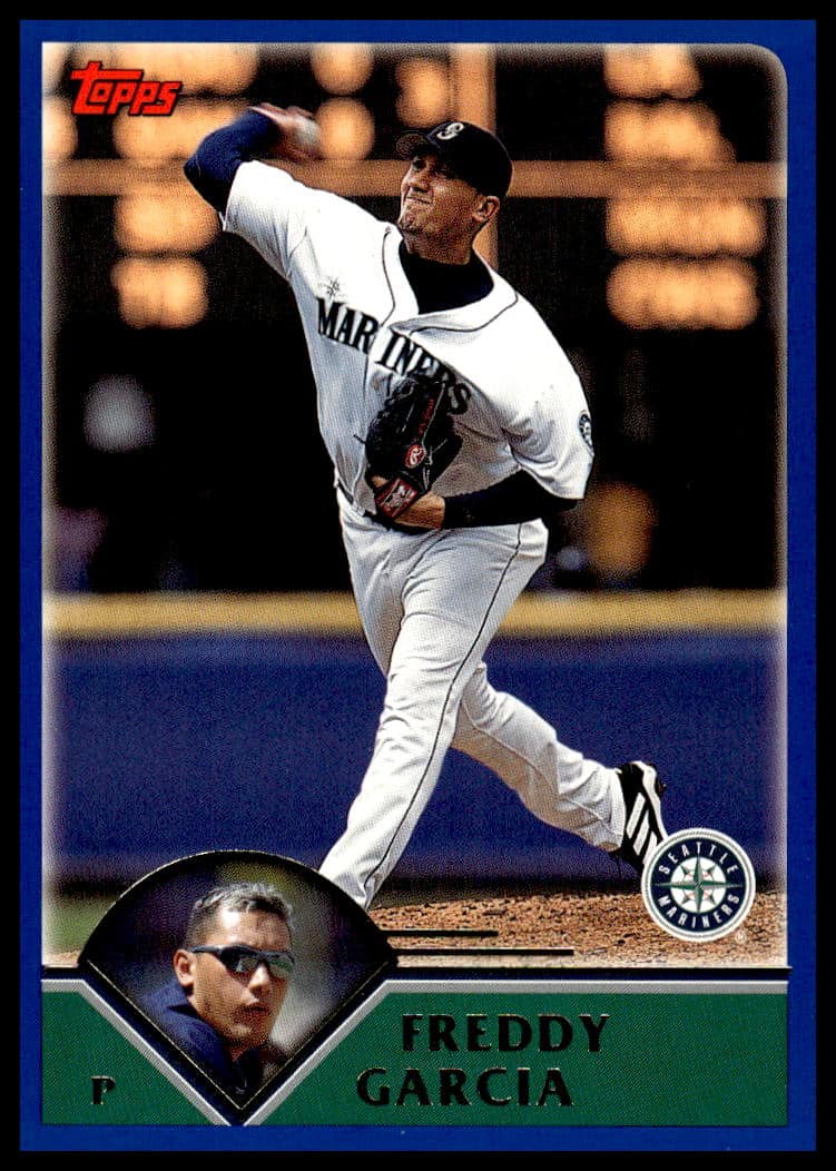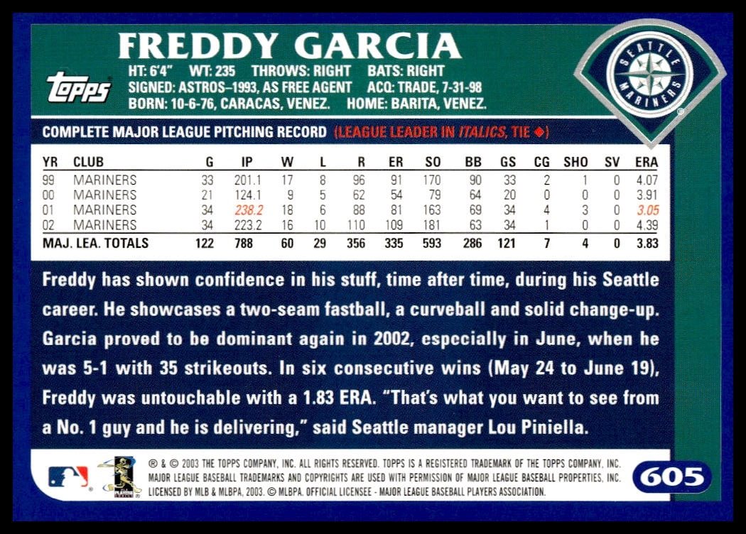 This Baseball card, from 2003 is part of the Topps  card set. Freddy Garcia is featured and has a card number of 605.