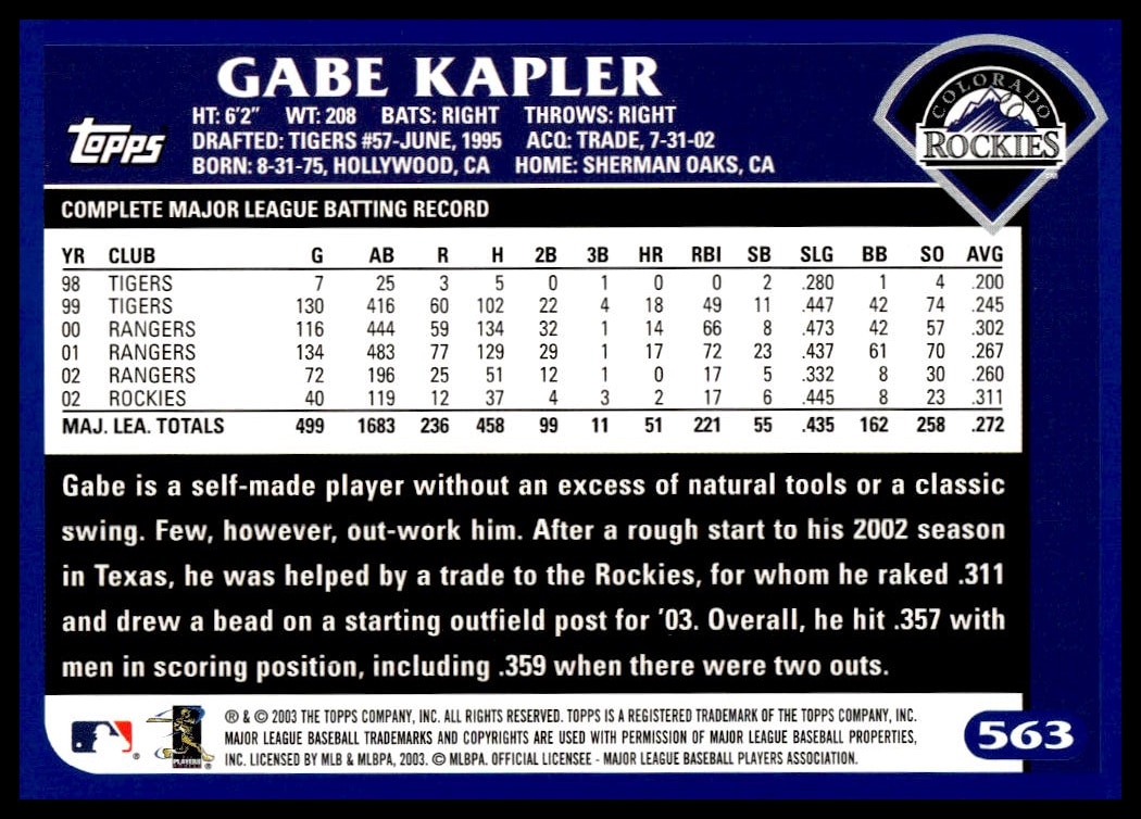 This Baseball card, from 2003 is part of the Topps  card set. Gabe Kapler is featured and has a card number of 563.