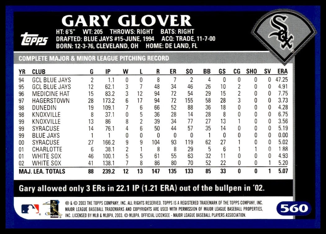 This Baseball card, from 2003 is part of the Topps  card set. Gary Glover is featured and has a card number of 560.