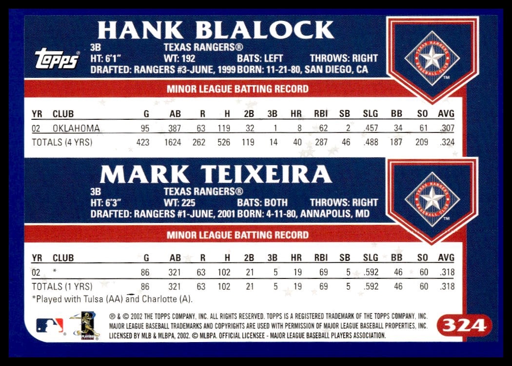 This BaseballΒ card, from 2003 is part of the Topps Β card set. Hank Blalock / Mark Teixeira is featured and has a card number of 324.