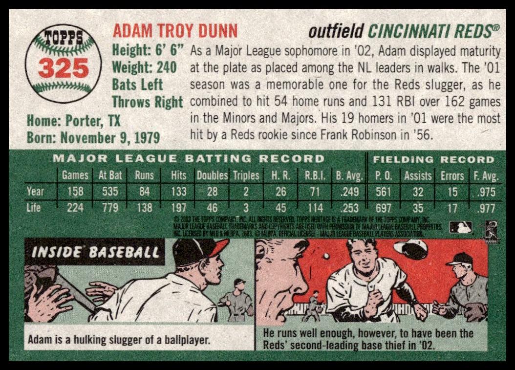 This Baseball card, from 2003 is part of the Topps Heritage card set. Adam Dunn is featured and has a card number of 325.