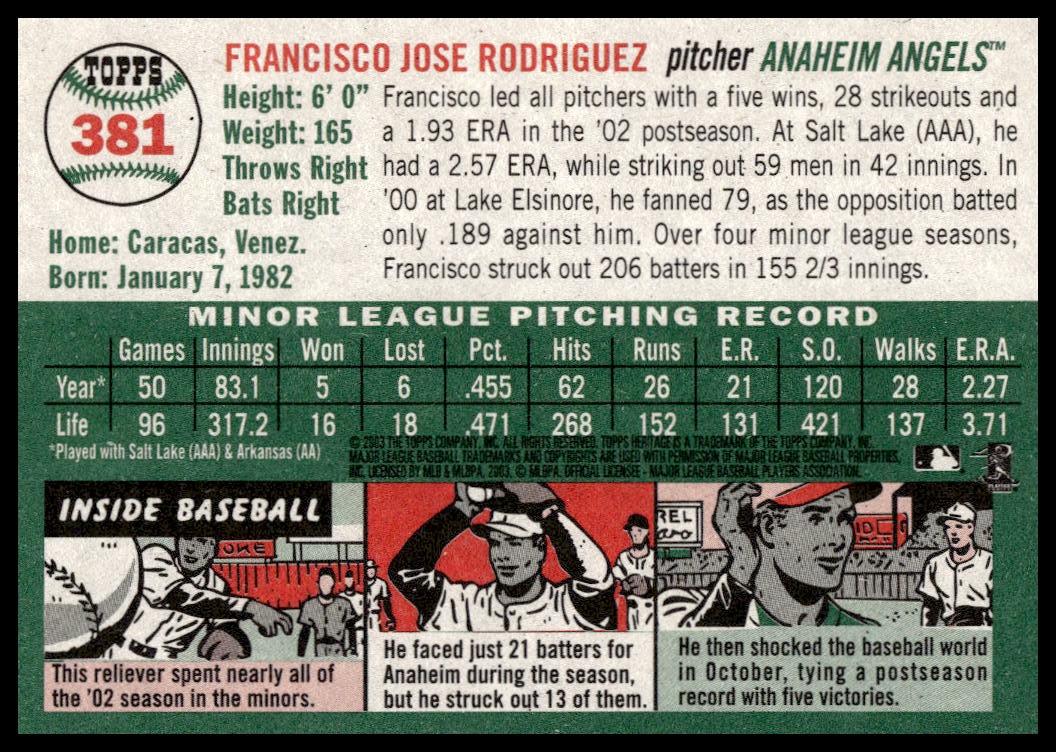 This BaseballΒ card, from 2003 is part of the Topps HeritageΒ card set. Francisco Rodriguez is featured and has a card number of 381.