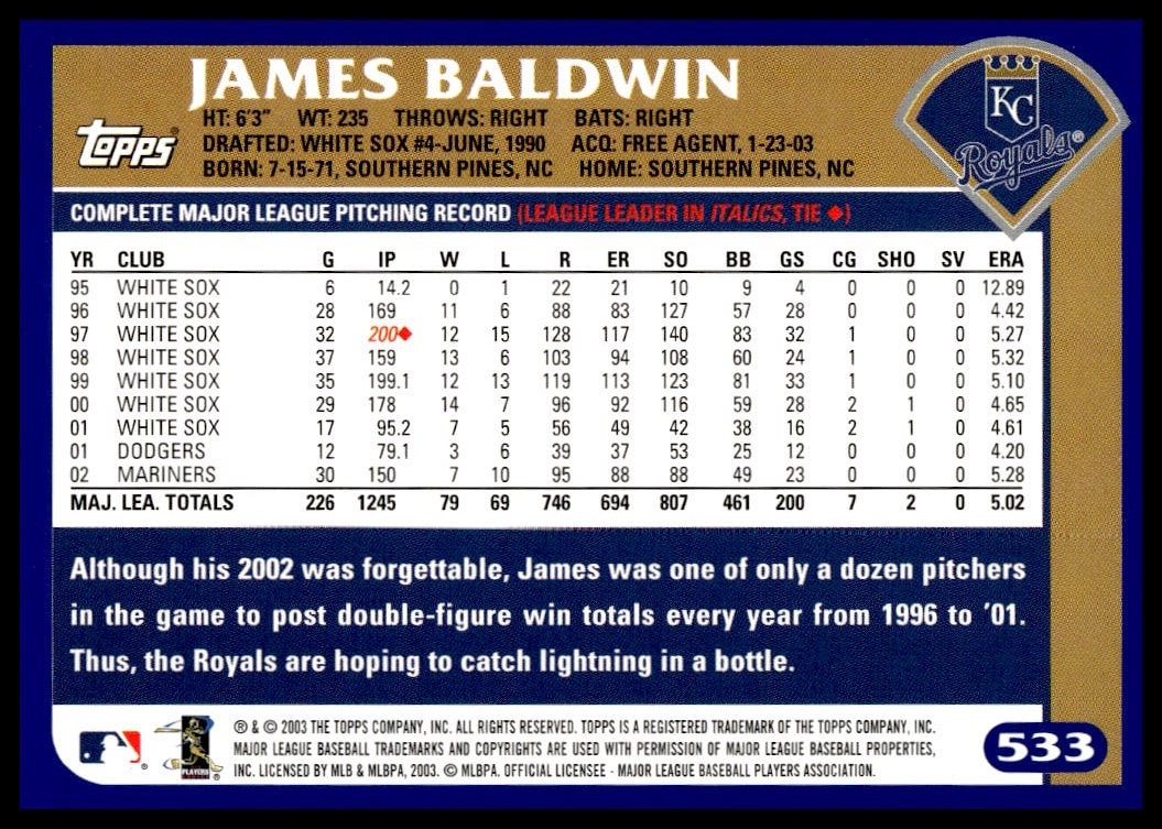 This Baseball card, from 2003 is part of the Topps  card set. James Baldwin is featured and has a card number of 533.