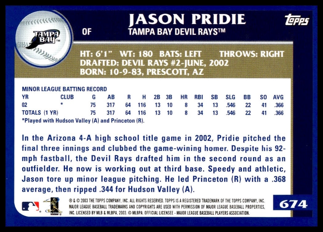 This Baseball card, from 2003 is part of the Topps  card set. Jason Pridie is featured and has a card number of 674.