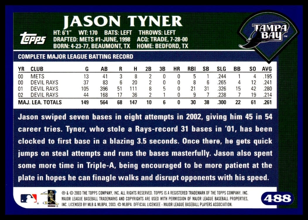 This Baseball card, from 2003 is part of the Topps  card set. Jason Tyner is featured and has a card number of 488.