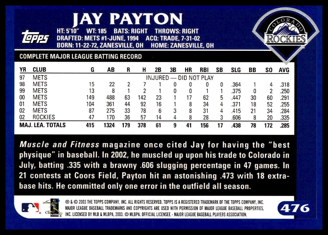 This Baseball card, from 2003 is part of the Topps  card set. Jay Payton is featured and has a card number of 476.