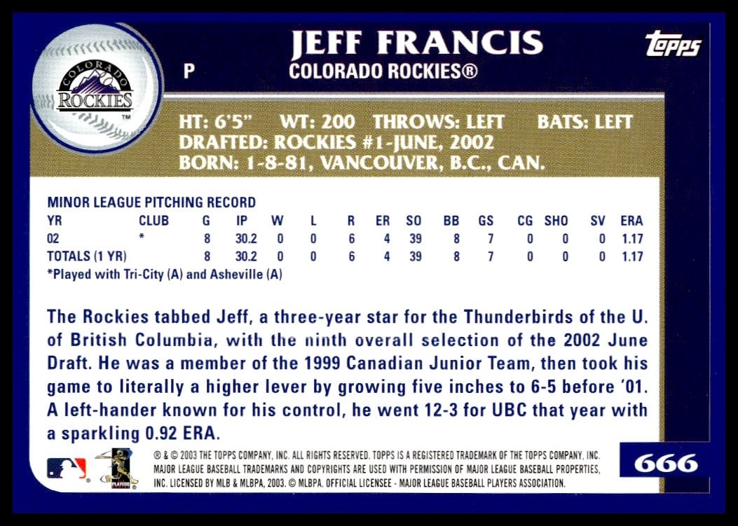 This Baseball card, from 2003 is part of the Topps  card set. Jeff Francis is featured and has a card number of 666.