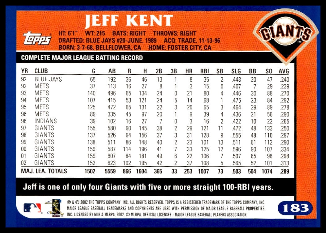 This Baseball card, from 2003 is part of the Topps  card set. Jeff Kent is featured and has a card number of 183.